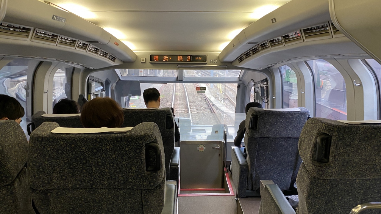 乗車時に特急券をチェックするため出入り口が少ないのでご注意を。その分停車駅も少なく、東京の後は横浜、熱海と普通の踊り子に比べてすっ飛ばしですが、時間的にはそれほど早くはなく、乗り換えいらずで車窓の風景をのんびり楽しむ種類の列車ですね。