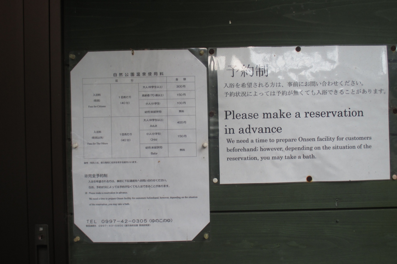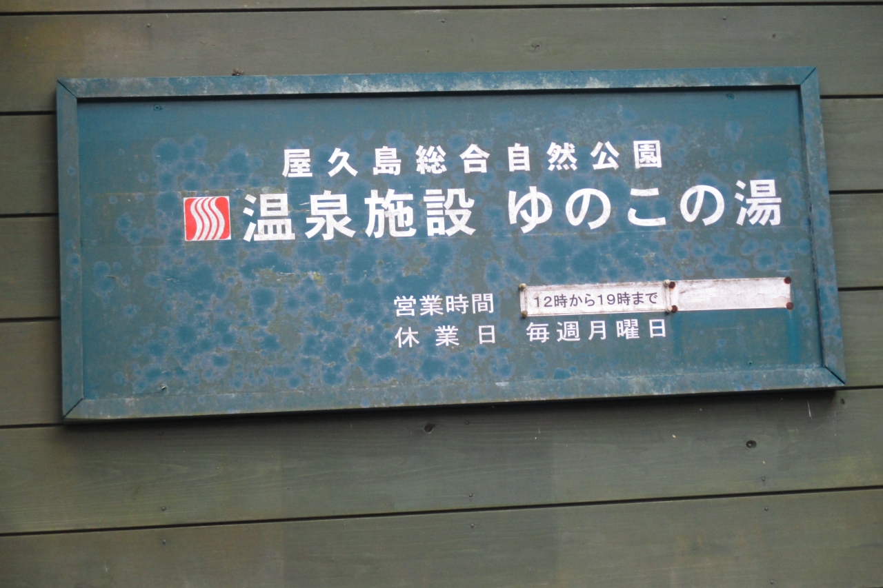 ゆのこのゆは屋久島総合自然公園の一画にありました。小振りな建物に2つの浴室(五右衛門風呂付き)があり、完全予約制40分間貸し切りで、料金は400円でした。貸し切りで400円とは随分安いと思いましたが、町営だからとのことでした。なお、屋久島の町民はちょっと安く300円だそうです。