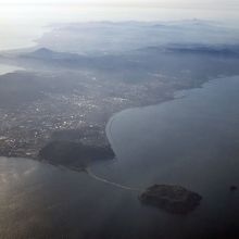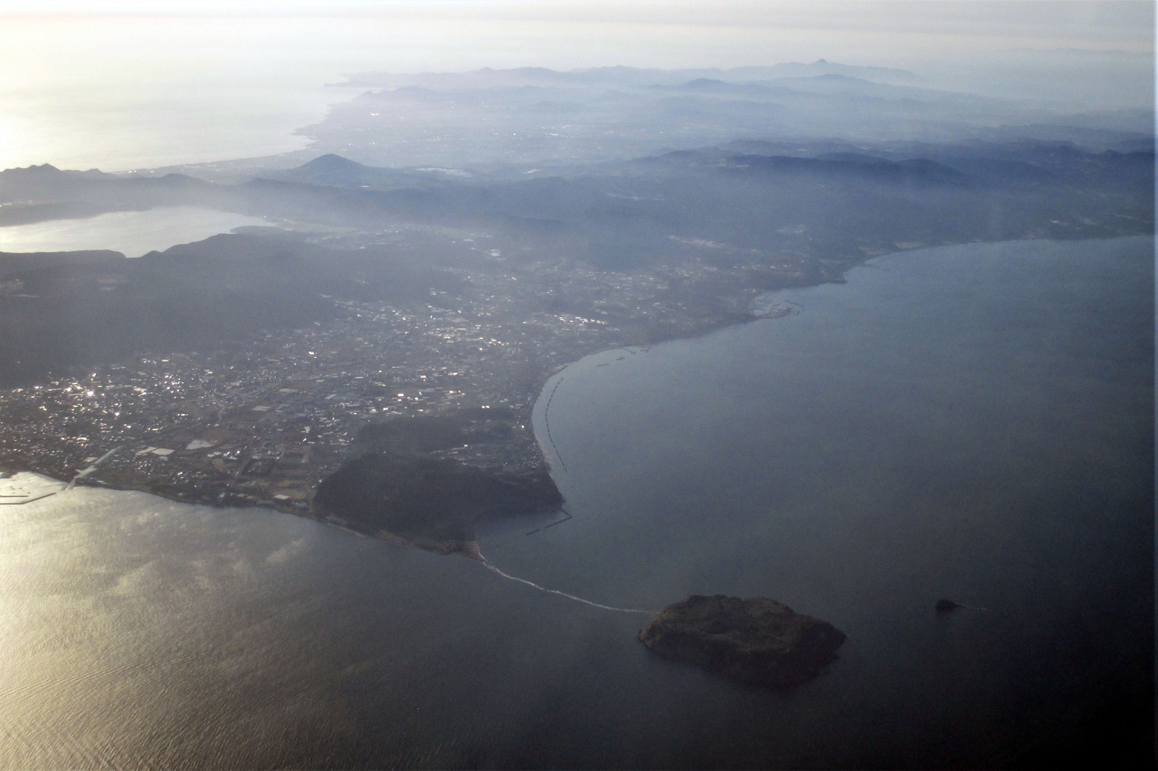 屋久島から鹿児島への航空便を利用したら、知林ヶ島と緩やかにカーブするちりりんロードが見えました。ちりりんロードはこれから消えてしまうところなのか、はたまた、これから現れるところなのか、砂地は見えず一番高い部分だけが波立って白っぽくなっっていました。また、左上には丸い池田湖も見えていました。