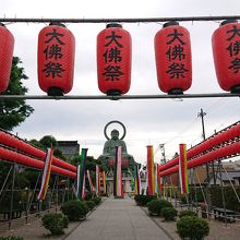 参道の突き当りの一段高い場所に大仏があり、台座の下に資料の展示があります。
