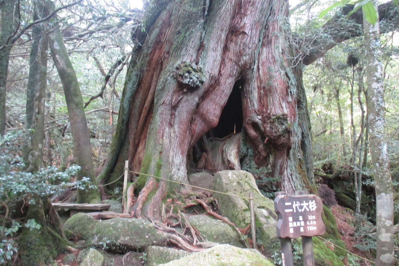 白谷雲水峡では、樹齢3000年と言われる弥生杉を見られれば「屋久杉を見た!」と満足できるとの思いで、弥生杉コースを廻りました。結果的には、弥生杉は周囲の木々に阻まれて見にくかったのに比べ、途中にあった二代大杉は比較的良く見え、特に一代目の部分のド迫力には圧倒されました。