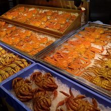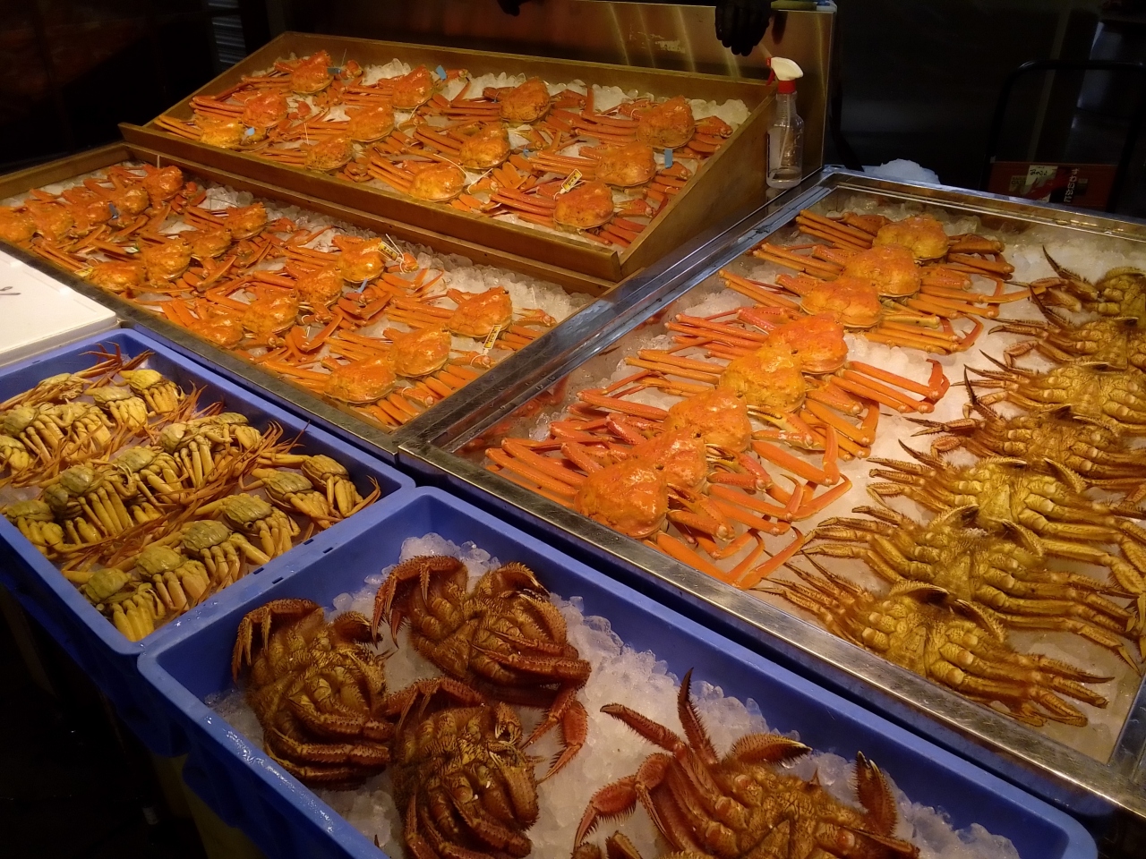 金沢駅から15分ほどまっすぐ歩いていきました。人でいっぱいのイメージだったのですが、8時ごろ到着したら、人もまばらでまだお店が開店準備をしているような状況でした。蟹がどんどん茹で上げられて氷の上に並べられていく様子は見ごたえあり!この先の予定があるため買い物はしませんでしたが、甘えびコロッケを買って朝ごはん代わりとしました。