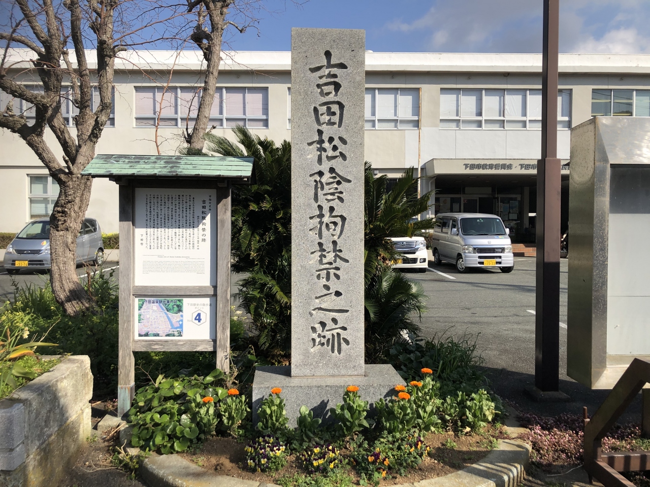 伊豆急下田駅のロータリー先の大通り、マイマイ通りを南下すること徒歩でも10分弱。了仙寺の一つ手前にあるハンギングバスケット通りと呼ばれる道を右折すると中央公民館の前に「吉田松陰拘禁之跡」という碑が建っています。