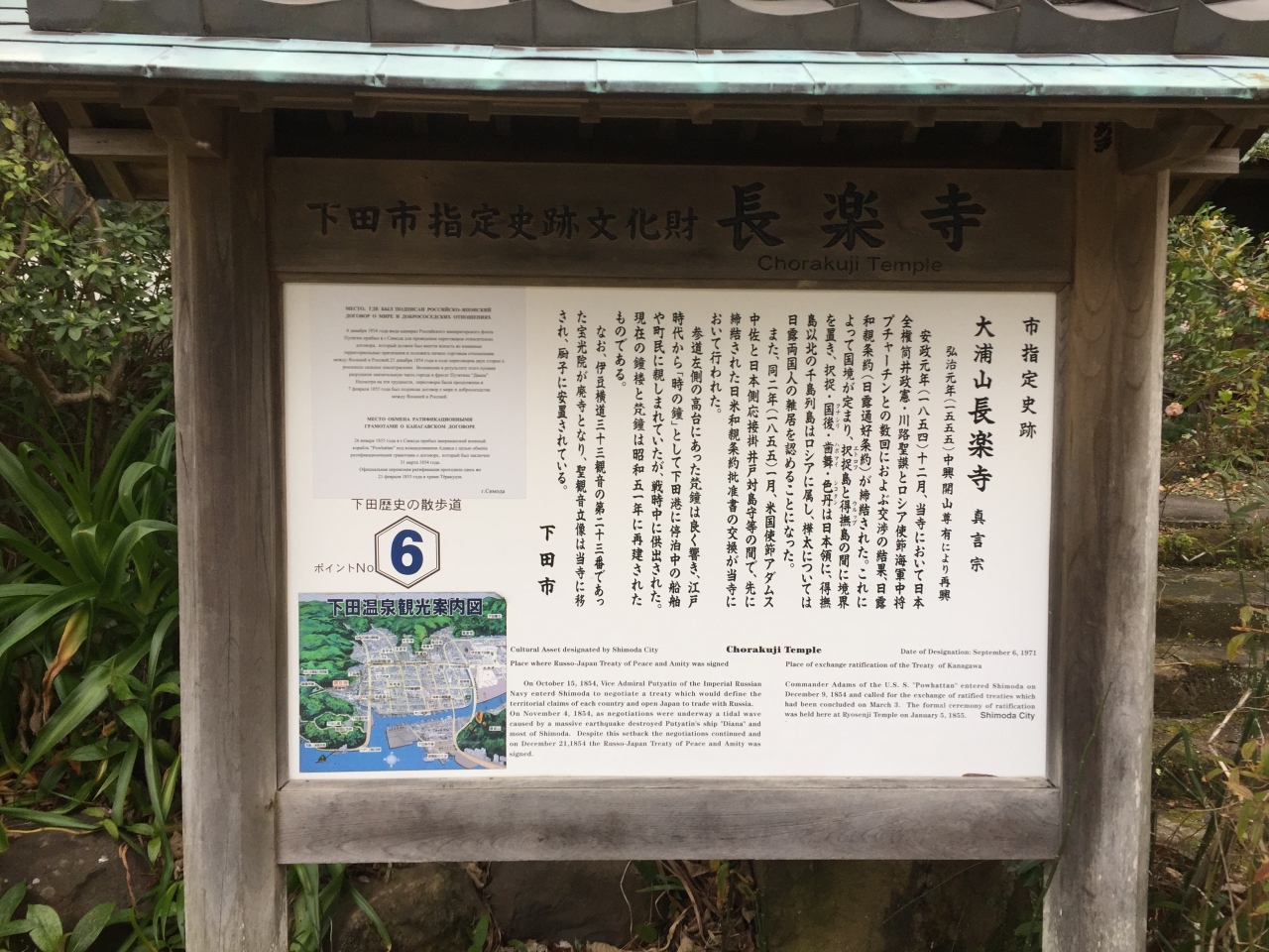 1854年、日米和親条約が締結されことを受け、ロシアが同様に、ここ長楽寺で交渉し、日露和親条約が締結されます。この条約では、箱館・下田・長崎を開港し、北方四島を日本の領土、樺太を両国の領土とすることなどが取り決められたそうです。ご近所には、日米和親条約(付録)が調印された了仙寺もありますね。