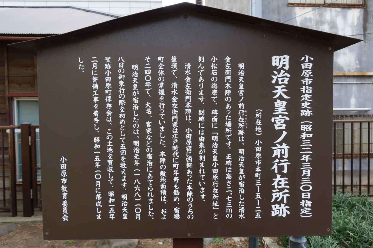 小田原城の南側にある本町交差点を東に50m程行った南側に小さな公園の様な場所があります。そこが明治天皇宮ノ前行在所跡です。小田原宿の清水金左衛門本陣跡に明治天皇は行幸にあたり5回も宿泊したそうです。石碑があるだけで見応えはありません。