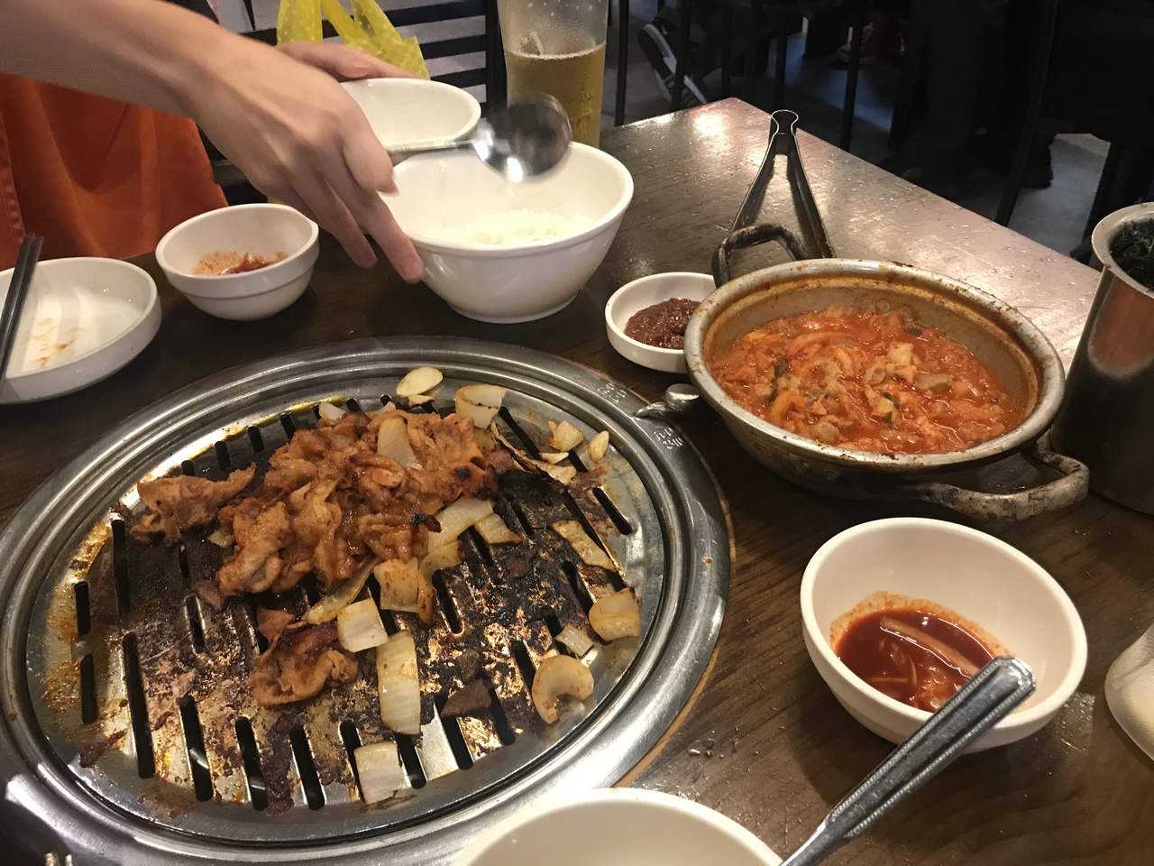 あまりの美味しさに今度は家族を連れて再訪しました。夜の7時前に着きましたがすでに満席。三組ほど前に待たれていました。30分ほど待ってようやく着席。今回は定番のプルコギとチゲに加え、サムギョプサルやチヂミも注文しました。どれも美味しかったですが、やはりヨルタンプルコギの香ばしさが病みつきになります。