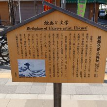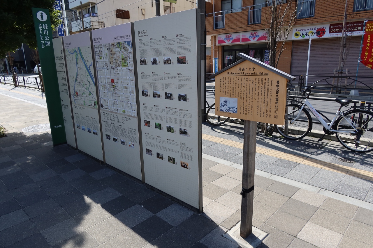 現在すみだ北斎美術館のある緑町公園の北東部の観光案内板の右手に葛飾北斎生誕の地がありました。この辺りが葛飾北斎生誕の地だとは知っていましたが、以前は北斎通り北側の東あられ本舗の前に立て札があったと記憶しているのですが、場所が変わったのは何故なんでしょう。ここら辺と言うことなのでしょか?