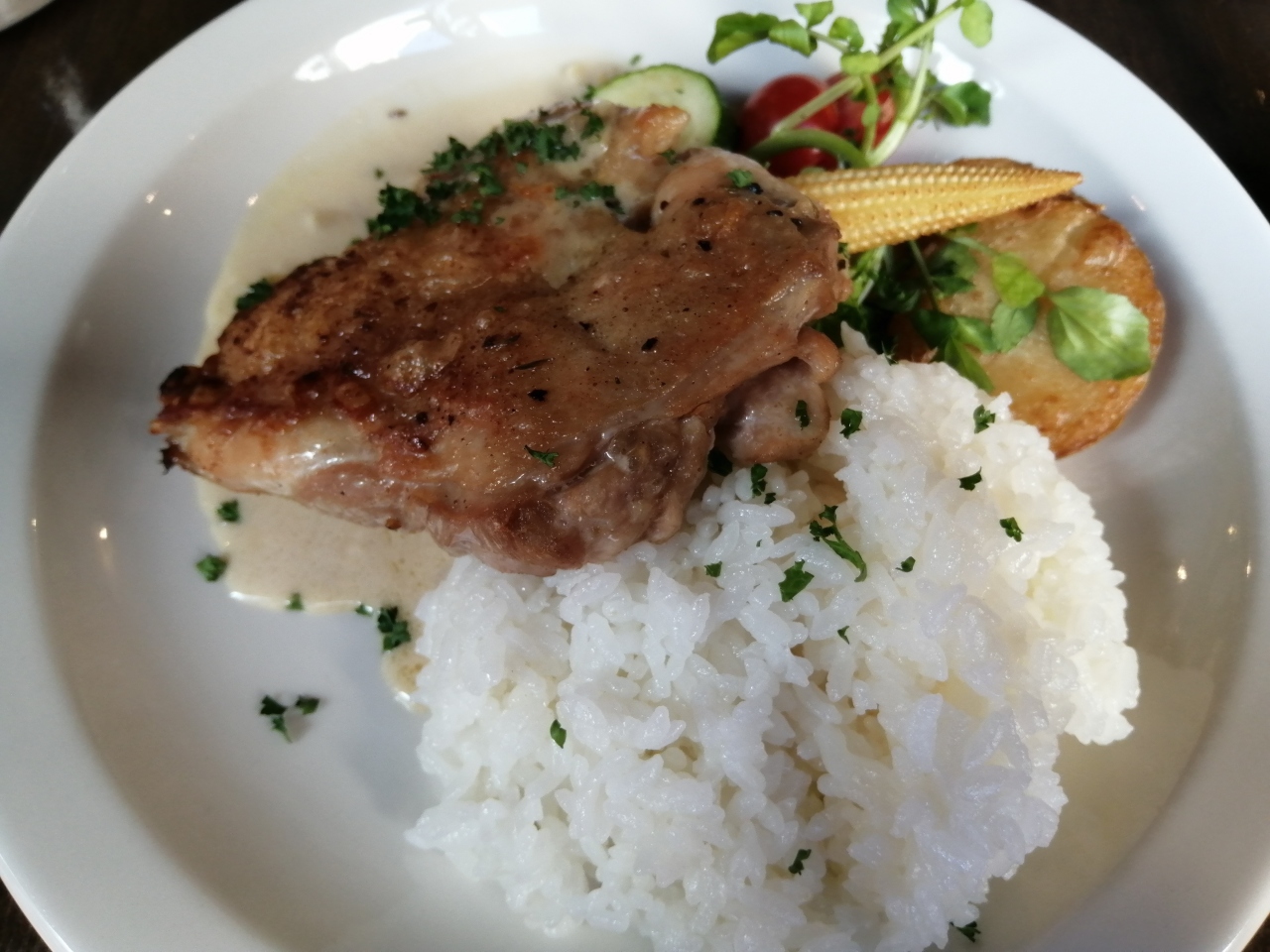 お肉料理のお店で、狭めです。ランチは全品¥1000で、メインを選んでサラダとドリンクは自分で取りにいく方式です。メインはワンプレートで出されます。