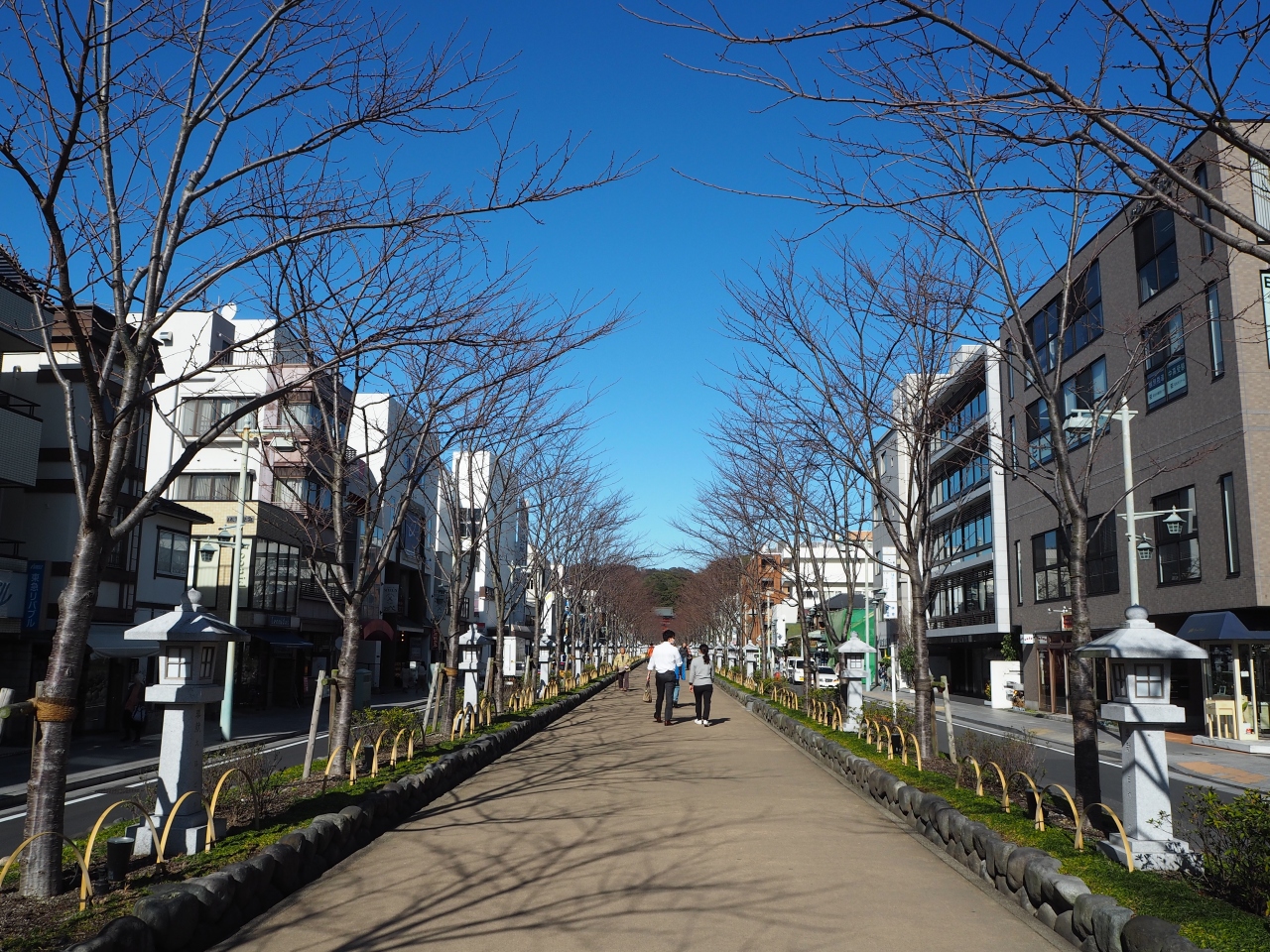 鶴岡八幡宮につながる通りで、車通りの多い大通りの中央に歩行者用の通路が設けられています。歩行者用通路の両側には桜の木が植えられていて、春の桜の時期にはとてもきれいだと思います。今回は2月に訪れたので、桜も葉もない状態で少し寂しい感じでした。