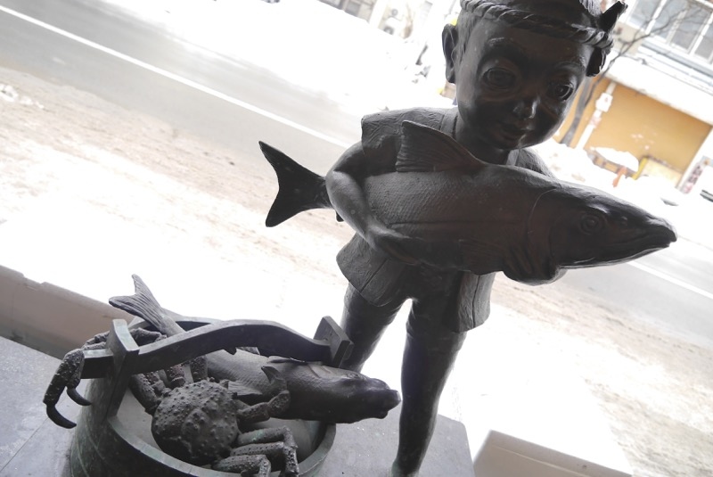 明治のはじめごろにできた市場で、100年以上の歴史があるそうです。大通りにも面したお店、それから、建物の内部に入り込んだところまで。たくさんのお店が並びます。どの店頭にもカニやウニ、ホタテなどの海鮮が。ついつい商品だけに目をとらわれがちですが、別のところに目を向けてみるとシャケを抱えている子供の像があったりして、遊び心もありました。