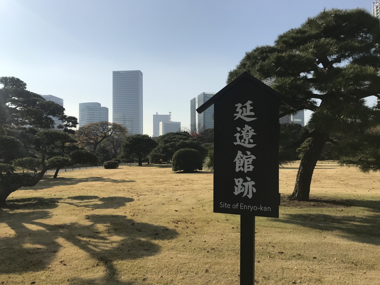 庭園を入場するとすぐ目の前に延遼館跡がありました。広い広場で、松が植えられていました。館の面影は何もなく、松園といった感じ。別名、表馬場とも呼ばれる場所で馬が行き来してたのかなと想像します。どんな屋敷が立っていたのか解説があるとよかったです。