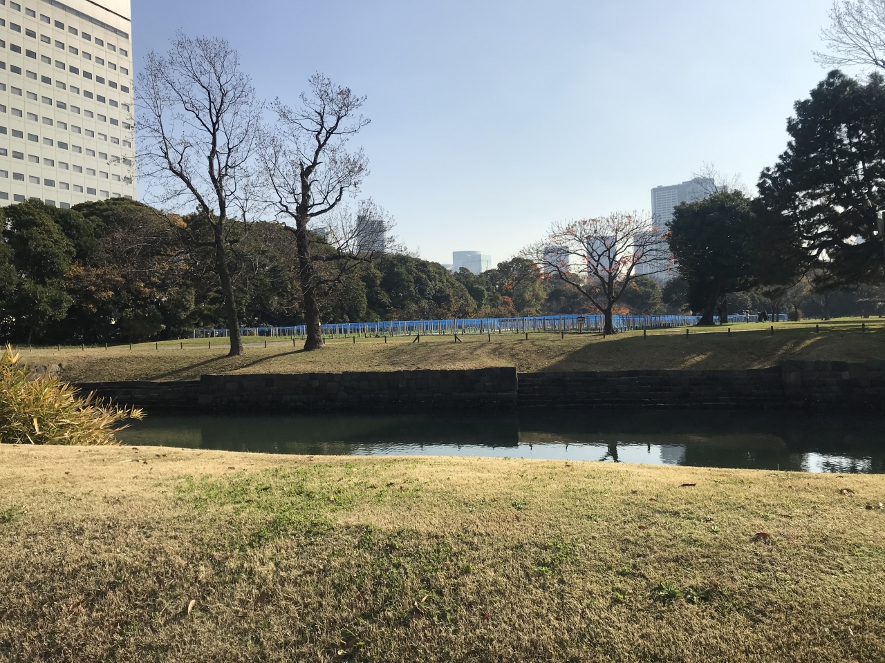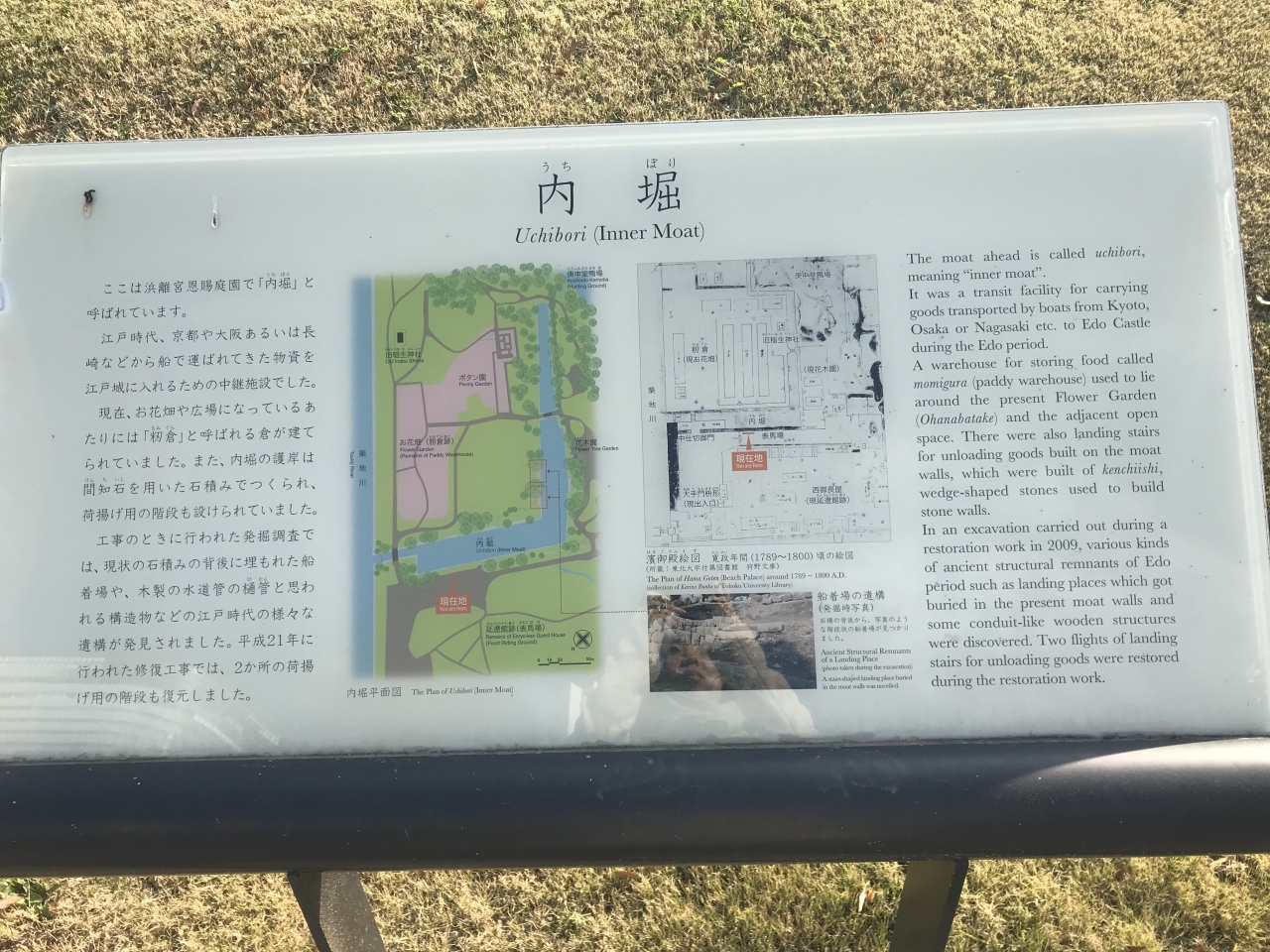 内堀は築地川とつながっていて地方から運ばれてきた物資を江戸城へ運ぶための中継地の役割をしていた。今は静かな場所ですが、当時は活気があったことだと思います。船着き場の遺構も発掘されていますが、今は埋め立てられていて実物を見ることができません。