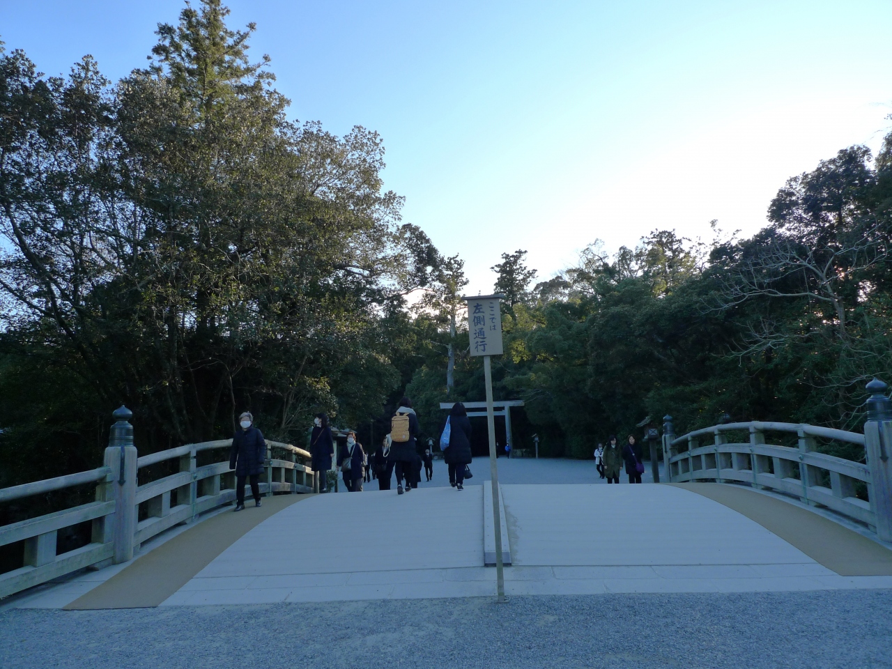 ガイドブックで外宮は左側通行、内宮は右側通行と勉強してきたが、予習していない人たちのために「ここでは左側通行」の案内が立ててある。それでも右側を歩いている人がいるから不思議。