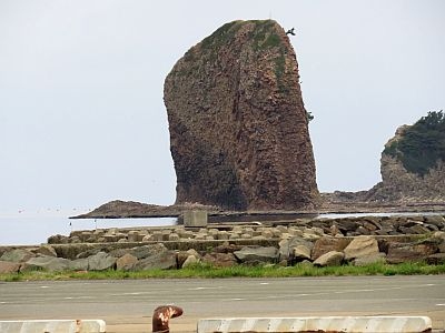 青森市と平内町との境界近くにある小さな島です。一つの立岩からできており、島として見ると確かに小さいですが、岩として見るとかなり巨大に感じます。その様は、海中にそそり立つ一本柱のようで、迫力ある景色でした。