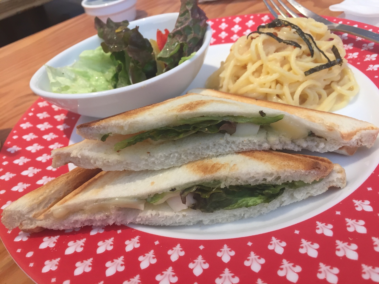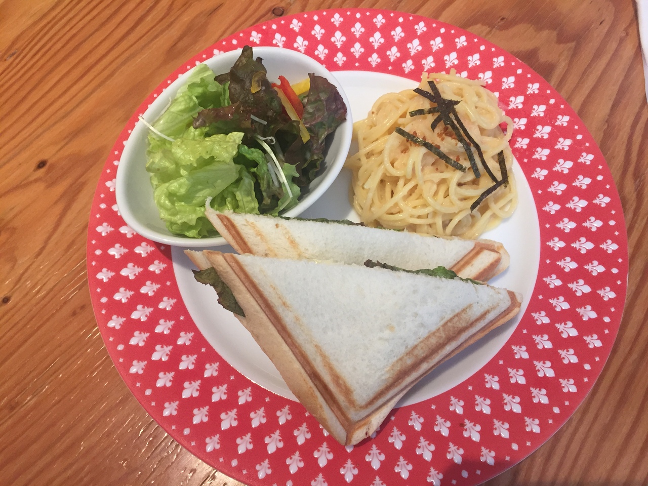 スペシャルと言ってもカフェメニュー パスタのハーフとサンドイッチと ちょこっと付け合わせ、タンパク質少なめ。