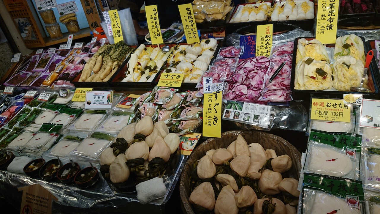 400年の歴史ある有名な市場。すっぽん、白味噌、スズメの焼き鳥、すぐき、奈良漬け等、見ていて面白い。