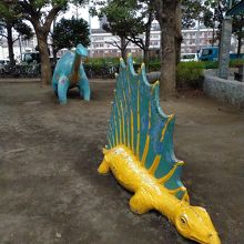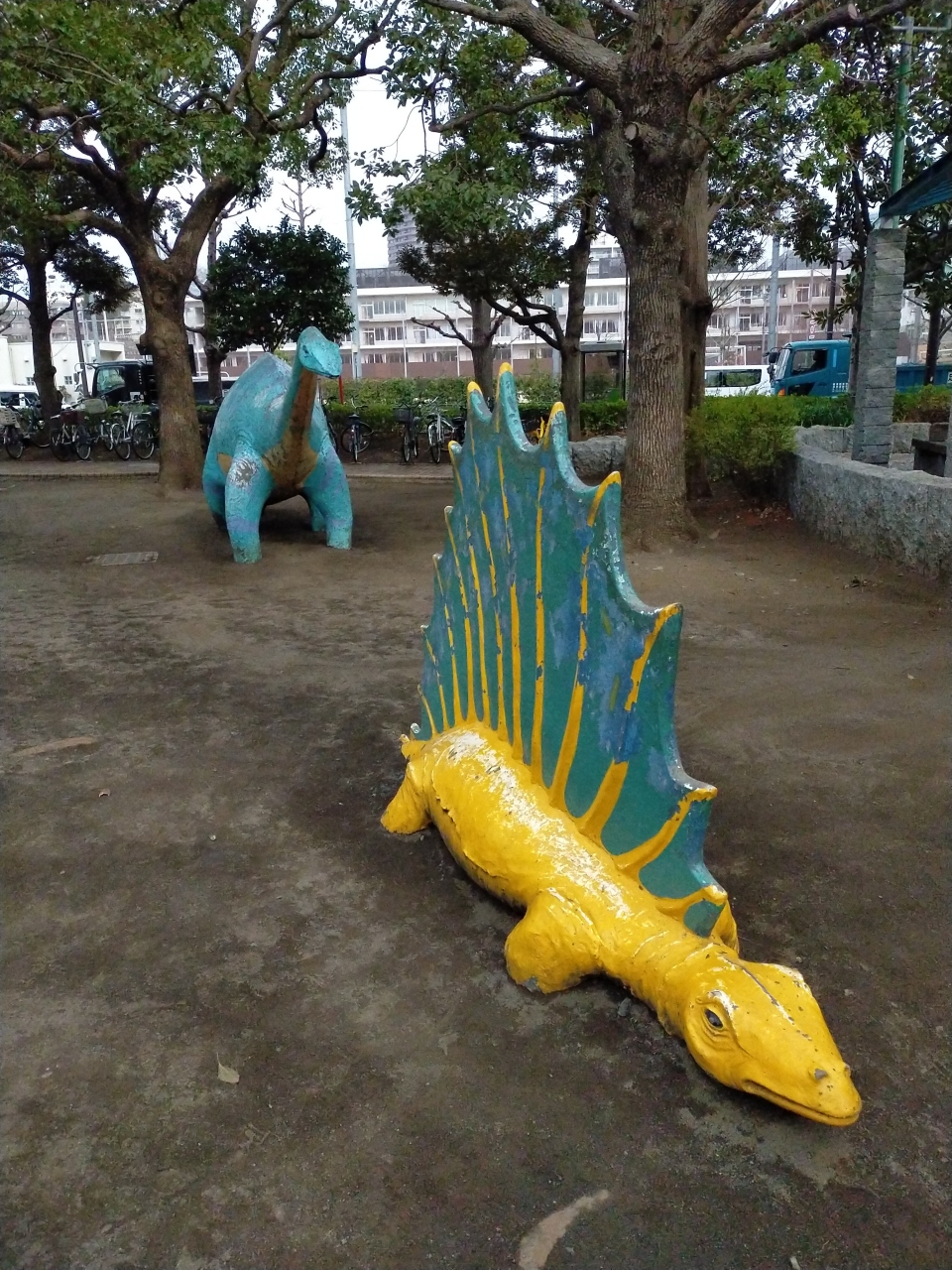 山手通りを大崎から品川方面に向かってJRのガードをくぐった右手にある公園には、色とりどりの恐竜がいます。