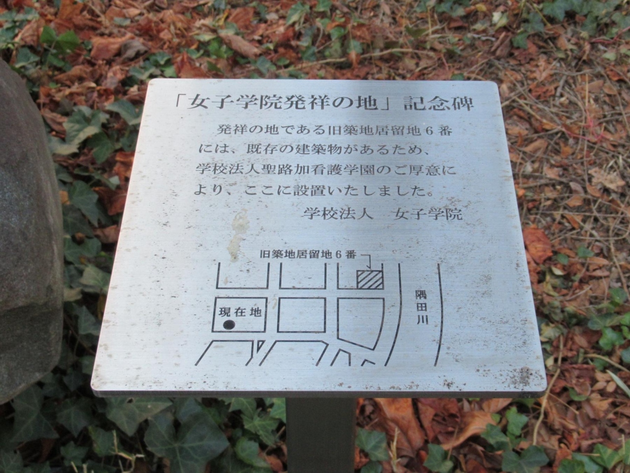 中央区築地界隈を散策の折、一寸足を延ばして聖路加国際大学の南側の聖ルカ通りを歩いていて気が付いたのがこの 女子学院発祥の地 の記念碑で、聖路加国際大学の聖ルカ通り沿いの植え込みに建ててあります。