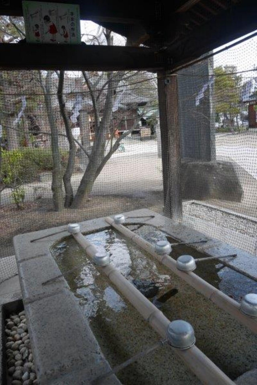 手水舎が、鳥よけのためか前面ネットでおおわれているのが印象的でした。