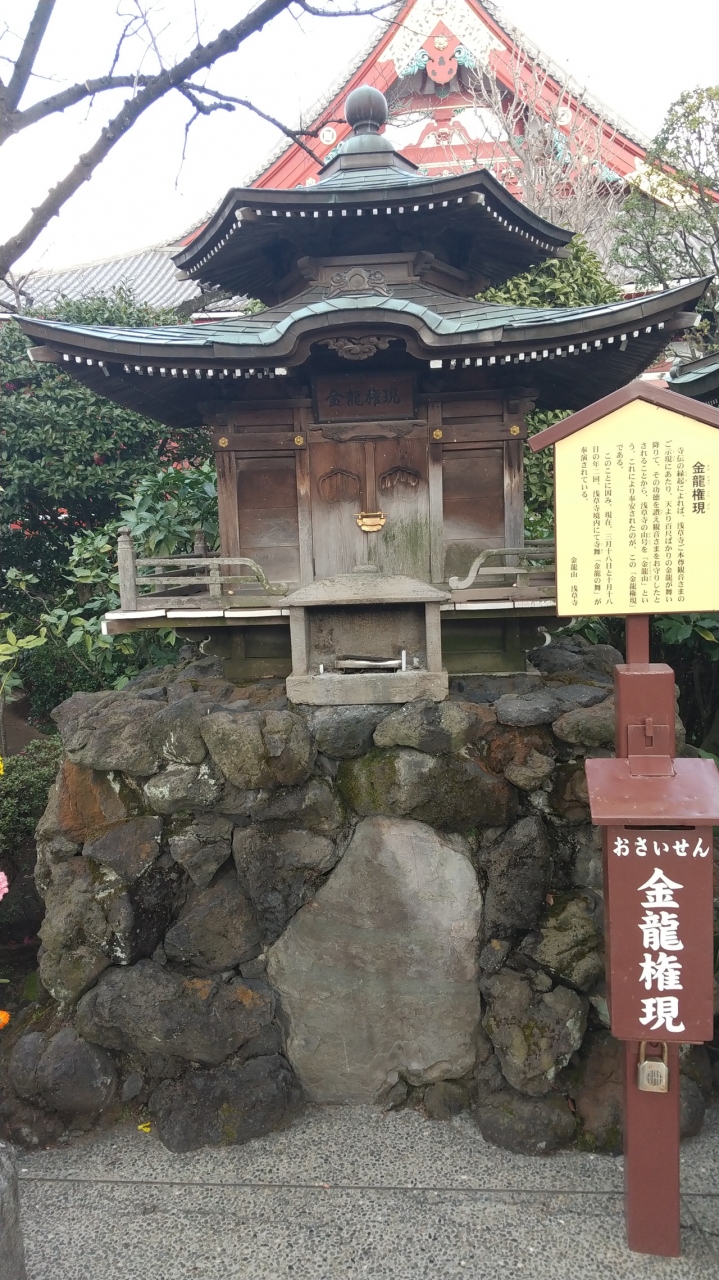 観光スポットとして有名な浅草寺。敷地内には小さなお堂やお寺,神社や石碑などがたくさんあります。その一つが,影向堂の傍にある金龍権現。天から百尺ばかりの金龍が舞い降りて観音様をお守りしたとされていて,金龍を奉安したのがこの建物です。