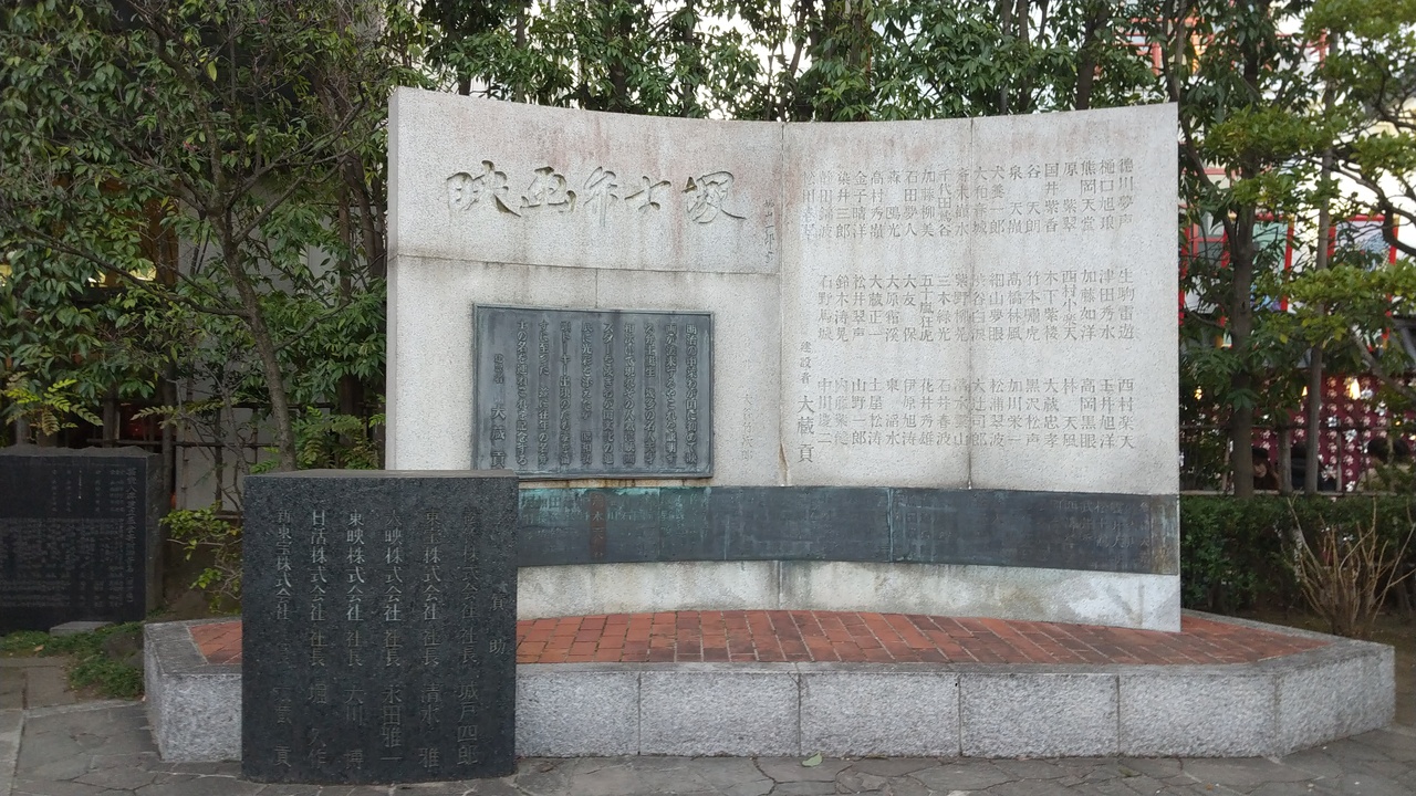 観光スポットとして有名な浅草寺。敷地内には小さなお堂やお寺,神社や石碑などがたくさんあります。その中の一つがこの「映画弁士塚」。昭和33年に建てられた石碑で,明治から大正時代にかけて活躍した映画弁士の名前が刻まれています。