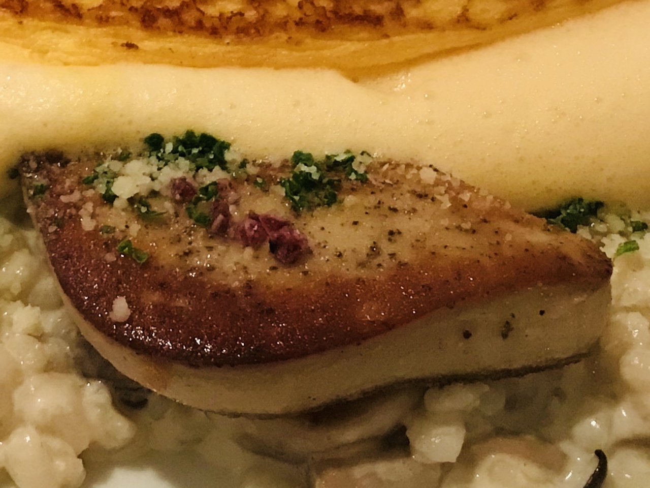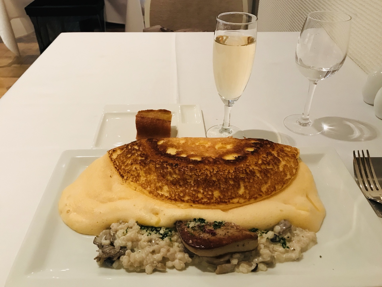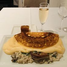 フォアグラは美味しかったのですが、オムレツの端っこの方はスフレというより、単なる泡立った半液状のたまご。