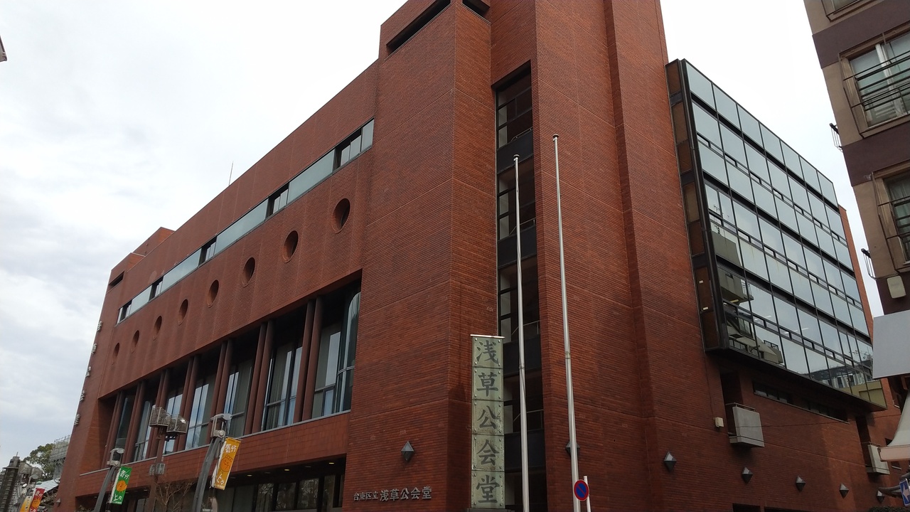 浅草公会堂は,賑やかな雷門通りから,オレンジ通りを北に向かった突き当りにあります。演芸の街浅草,漫才から歌舞伎まで色々な催しがあるとのこと。入口に広がる,有名人の手形とサインがあるスターの広場も有名です。