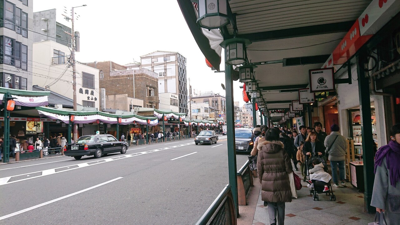 お向かいの歩道を見ると、祇園の商店街のムードたっぷりの外観です。