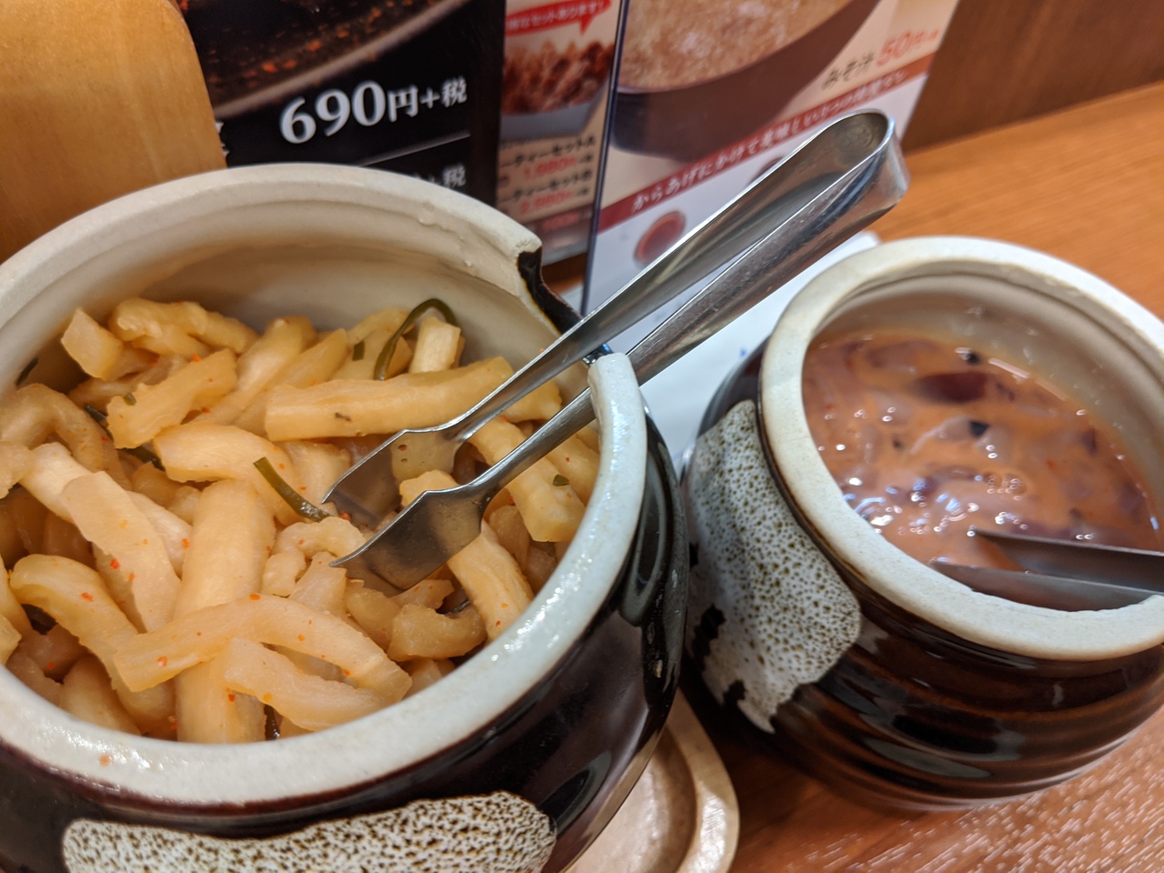 唐揚げのチェーン店のからやま、休日の夜は混み合っています。店内で食べるだけでなく持ち帰りメニューも充実していますが、店内でいただく場合にはテーブルに塩辛と沢庵の壺か置かれていて食べ放題なのが嬉しいです。
