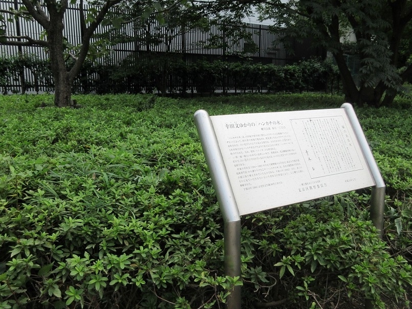 後楽園駅界隈を散策した際、春日通り沿いの礫川公園内に立ち寄った際、一見すると何の変哲もない木なのですが、手前に説明書きがあったので読んでみました。それによると幸田露伴と幸田文の家の庭にあった木を、こちらの礫川公園に移植した物とのこと。春の終わり頃にはハンカチをひろげたような形の葉が楽しめるとのことですが、私が訪問したのは10月でしたので、どういう姿か想像さえ出来ませんでした。よほど植物好きの方でない限り、気にも留めずに通り過ぎてしまうと思います。