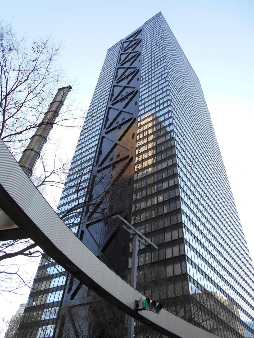 側面にあるX型の鉄骨がとても印象に残るシックなビルという印象。頑丈にできている力強さも感じられました。