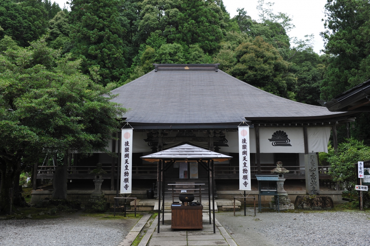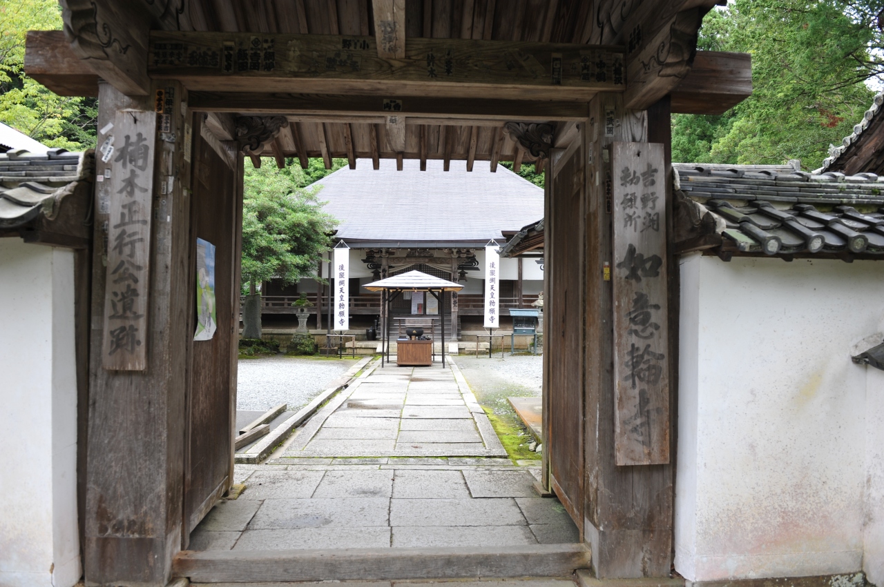 後醍醐天皇の勅願寺であり、境内には天皇陵がある。楠木正行は足利尊氏との決戦を控え、天皇陵に参拝した折りに辞世の句をやじりでこの寺の扉に刻んだという。有料ゾーンの展示スペースにはこうした史実関連の寺宝が展示されている。金峰山寺の門前町とは少し離れており、歩くと結構、距離がある。この日は自動車で吉野山に上ったが、下千本の駐車場に止めて金峰山寺を参拝した後、駐車場に戻って自動車に乗り、如意輪寺に向かった。如意輪寺の駐車場は広いし、帰路に使った観光用の道路は広く、ふもとまで便利だった。