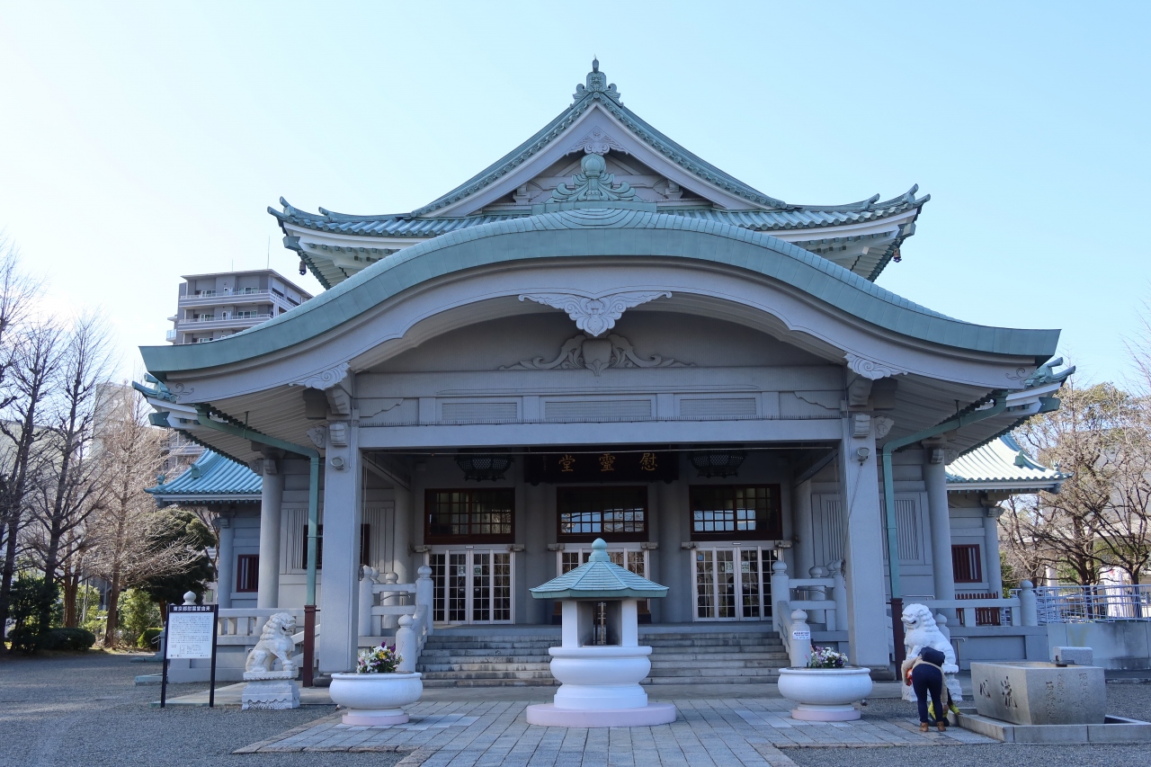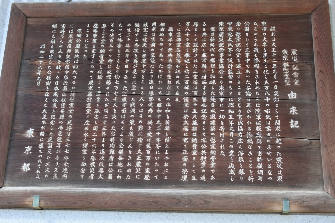 両国駅から10分程歩いた横網町公園の正面に建つ大きな建物が東京都慰霊堂です。大正12年に起きた関東大震災、太平洋戦争中の東京空襲で亡くなられた方の遺骨が納められている霊堂です。オリエンタル風な外観の建物の中には広い空間があり、周囲には震災時の写真などが掛けられ当時の様子が伺えます。