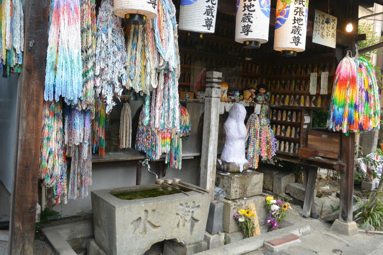 山門を入ってすぐ左に紙張地蔵がおられます。紙張地蔵のまわりには、奉納された小さなお地蔵様や人形が置かれ、また、千羽鶴も多数吊り下げられていました。治したいところに紙を貼るそうなので、やはり病気がなおることを祈願してのことなのでしょうね。