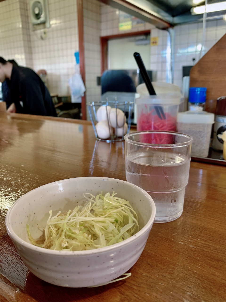 先ずは付き出しとして小鉢にキャベツが配膳されます!コレは全国的にも珍しい~まあ胃がもたれないような気遣いなだろうと思いますねーラーメンが来る前にキャベツをチャチャッと食し終わったくらいにラーメンが配膳されてきます。