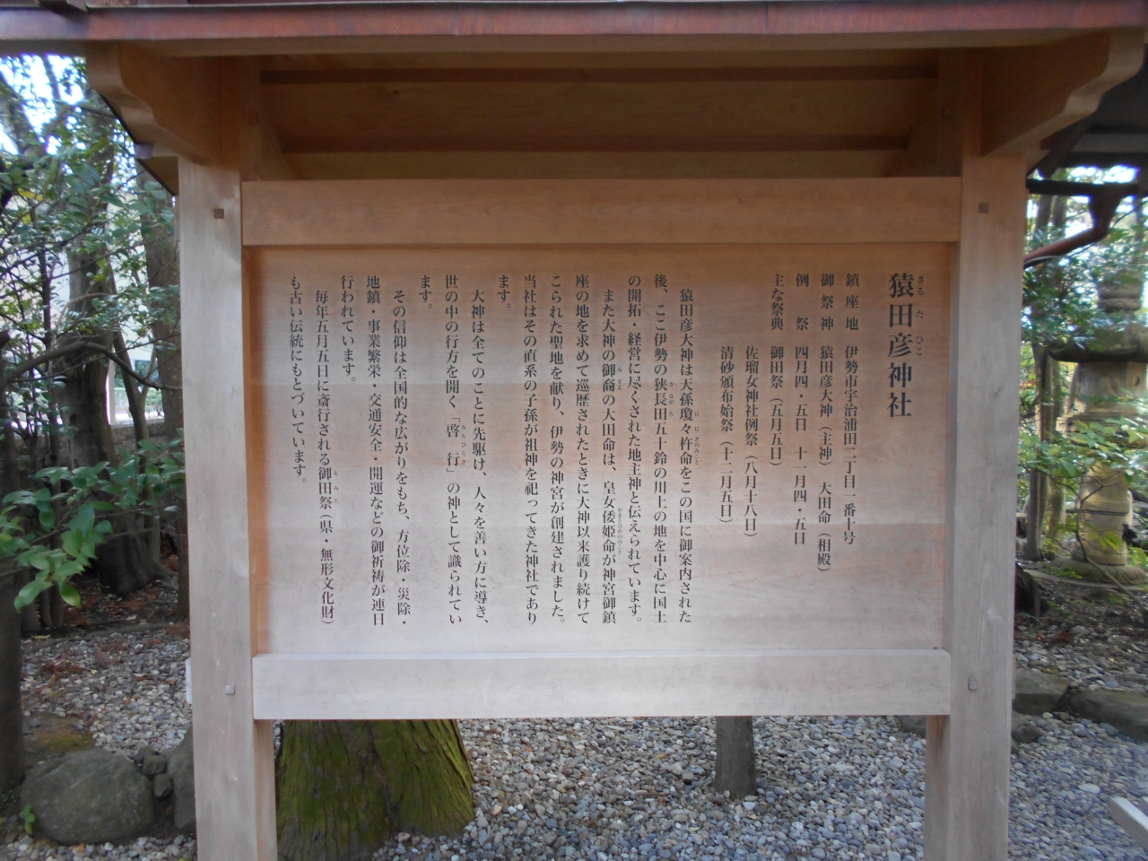 伊勢神宮内宮近くに鎮座する神社で猿田彦大神とその子孫大田命を祭神としています。猿田彦神は瓊瓊杵尊の天降りの先導を終えて五十鈴川の川上に鎮まったとされています。そのことから道開き・交通安全・方位除けの神社として信仰されています。本殿は特殊な妻入造り建物で鳥居や欄干には八角形の柱が使われています。また境内には佐瑠女神社が鎮座しています。全国2千社ある猿田彦神社の総本社のこちらの神社にも是非参拝してください。