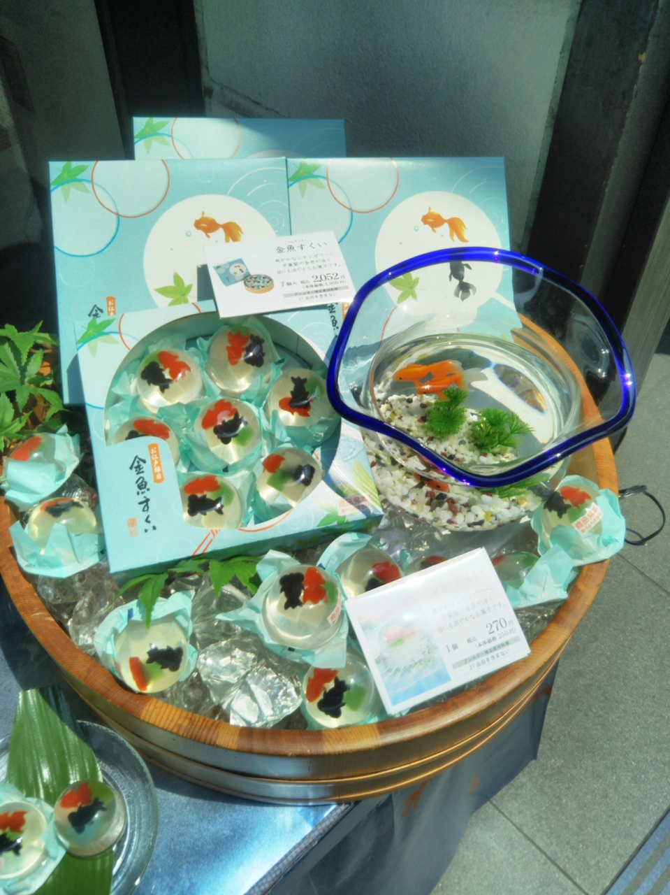 夏になると店頭に金魚鉢が飾られます。たらいの中には、日本橋屋 長兵衛の「金魚すくい」という、夏らしいお菓子が。