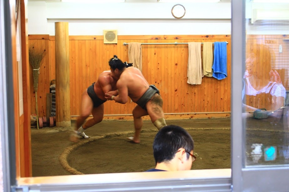 日本橋両国方向へ歩く途中で偶然発見。前には外国人の人だかりができていました。朝稽古が始まったのでその様子を窓越しに見学。対戦していたのは若手でまだ下位の力士のようでしたが、実際に間近に見ると本場所を見るのとはまた違った迫力と熱気が伝わってきました。