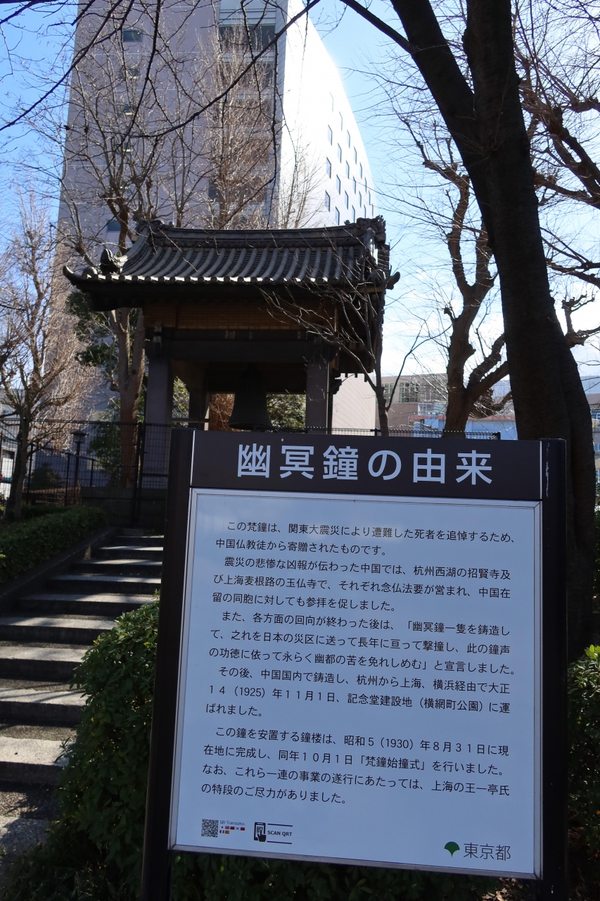 両国駅から10分程歩いた横網町公園の公園管理事務所の左手に鐘撞堂があります。そこに釣られている鐘が幽冥鐘です。中国の仏教徒から関東大震災の死者を追悼するために贈られた鐘だそうです。その為、日本の寺院で見られる鐘とは一風形状が特徴的です。柵が空いており鐘撞堂の中に入れ、鐘を突ける状態でしたが、さすがに突くのは止めました。