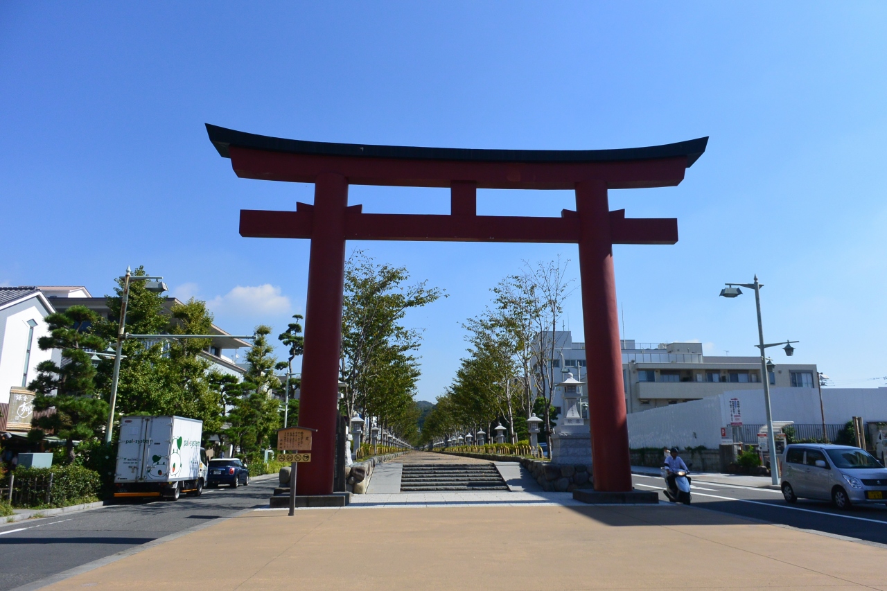 若宮大路の参道・段葛が始まるところに建つ赤い鳥居です。鳥居の向こうには並木と灯篭が並ぶまっすぐ続く参道が見えます。人も少なかったので。とても素晴らしい光景でした。鶴岡八幡宮に参拝するなら鎌倉駅から二の鳥居へ来て段葛を歩いて八幡宮に行くのがおすすめです。