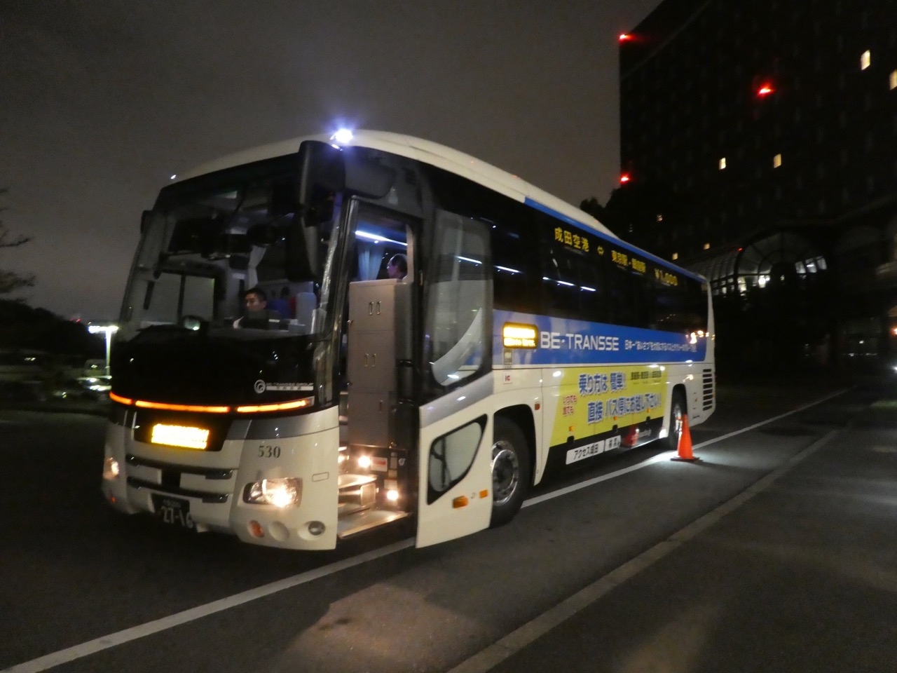 銀座・東京から成田空港へのバスですが、夕方からは成田空港周辺のホテルへの送り込みのバスになります。電車+無料送迎バスに比べて便利です。しかも高速バスタイプですからゆったり、荷物の心配もありません。ただ、その初便は銀座からは空席があったのですが東京駅では満席に。やはり始発のバス停から乗車するのがバスの基本のようです。