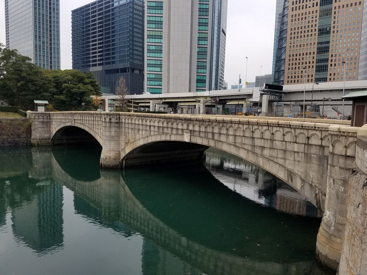 浜離宮恩賜庭園の北側の角にある石造りの橋で渡ると大手門に至ります。架かっているのはお堀かなと思ったら築地川というれっきとした川でした。橋の上は舗装道路のように見えてあまり趣が無いので橋は外観を横から見るのが良いと思います。それも海側から見ると背景の高速道路と同化してしまうので陸側から見るのがおすすめです。