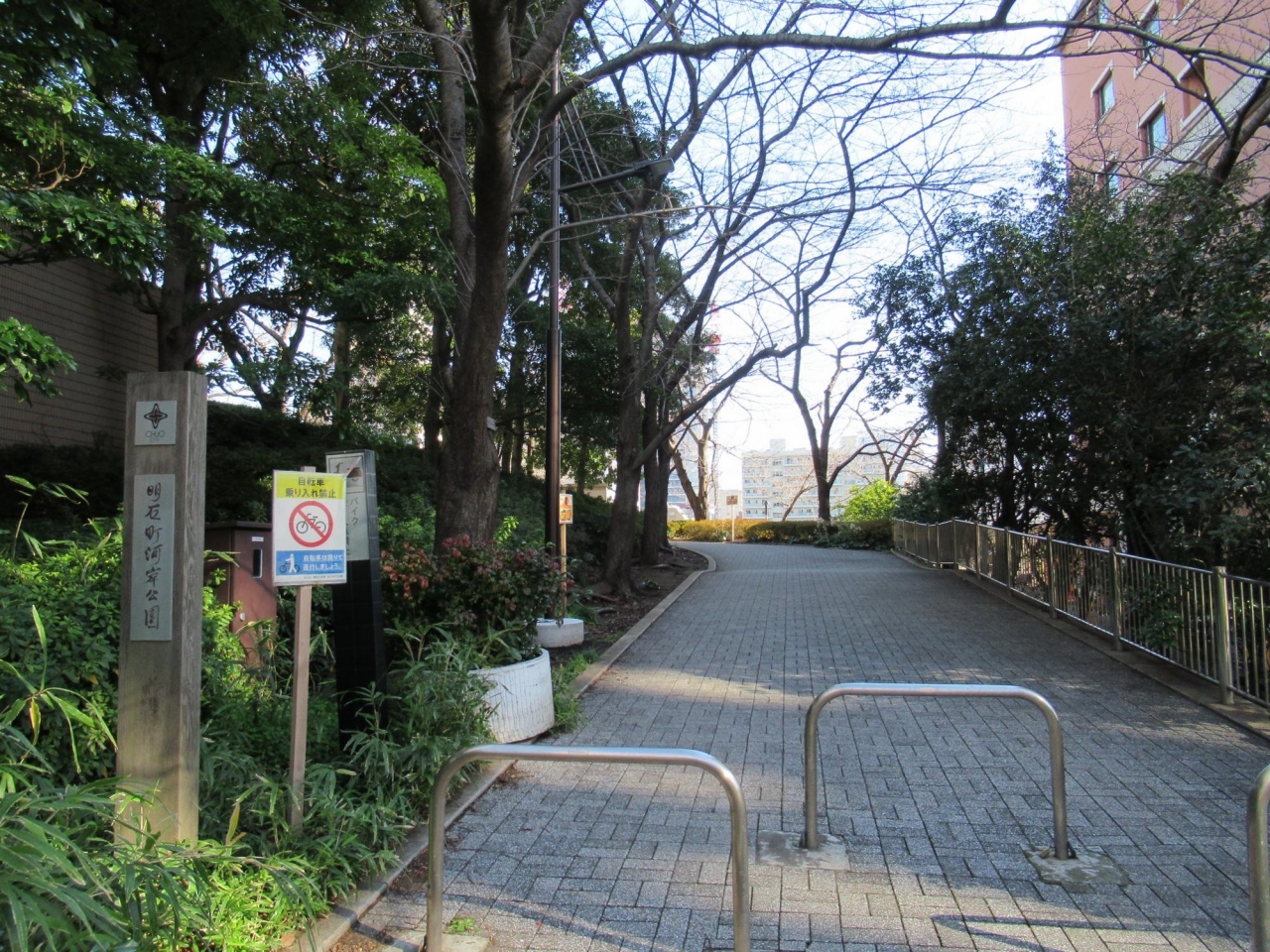 - 明石町区民館の南西隣りはほぼ平坦だが北東方向に細長い遊歩道へは出入りするのにやや坂になっています