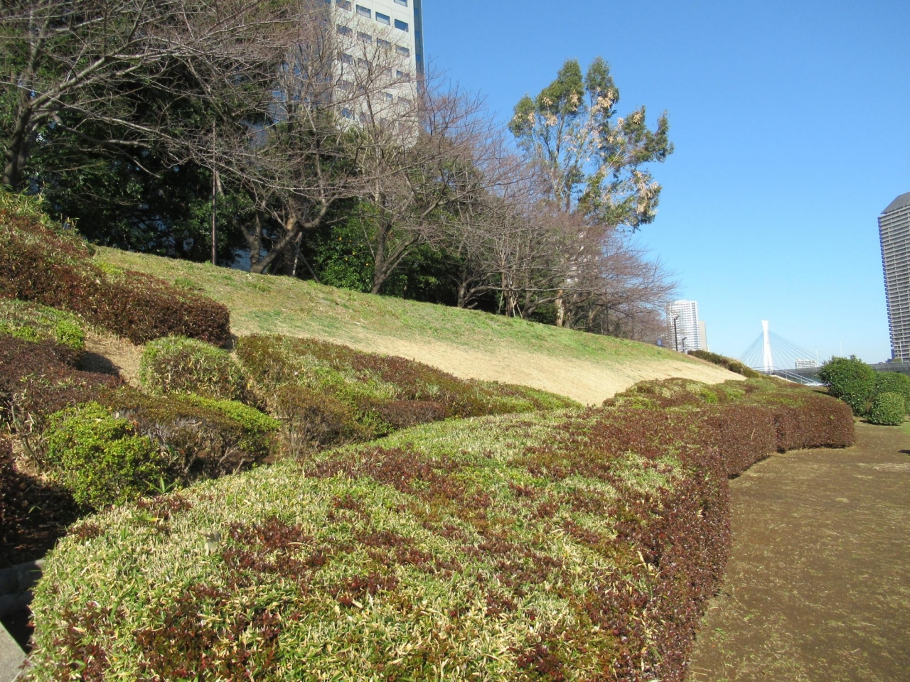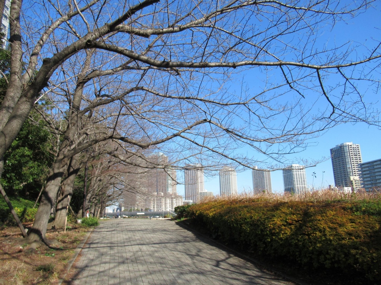 明石町区民館の南西隣りは、普通の公園だが、北東方向に細長い遊歩道は、隅田川テラスより高いところを並行していて、眺めを遮らないようにでしょう片側だげ桜の木が植えてあるため、桜花の時季には素晴らしい眺めになること と思います。