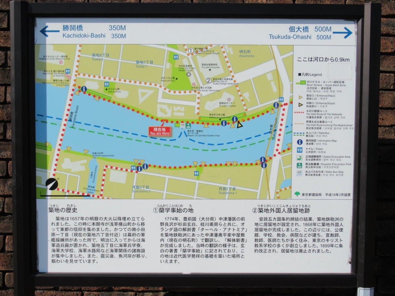 - 地下鉄・築地駅出入口3bを出て聖ルカ通りを右手(南東)方向に6分強進んだ聖路加ガーデンの右手奥が細長い遊歩道の出入口なので歩いて7分弱です