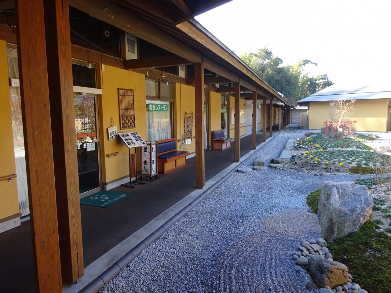 施設は上から見ると六角形に近い形をしていて、フロント、浴室、大広間などはそれぞれ渡り廊下のような通路でつながっています。廊下の途中には「ほたる」という食堂や家族風呂もあります。