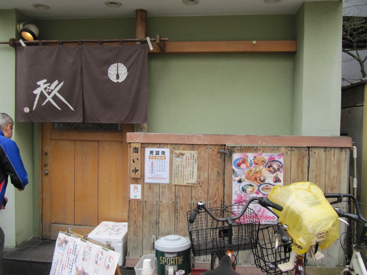 店頭には毎日行列ができています。お昼のメニューは天丼三種類。天丼(海老二本、魚介、鶏、野菜、海苔、玉子)と、えび天丼(海老四本、野菜、海苔、玉子)は1300円、江戸前穴子入り天丼は1700円で何れも税込み。特に、寒い冬には無性に食べたくなる一品です。開店は11時から(今日は11時10分でした)。定休日は概ね月曜日です。