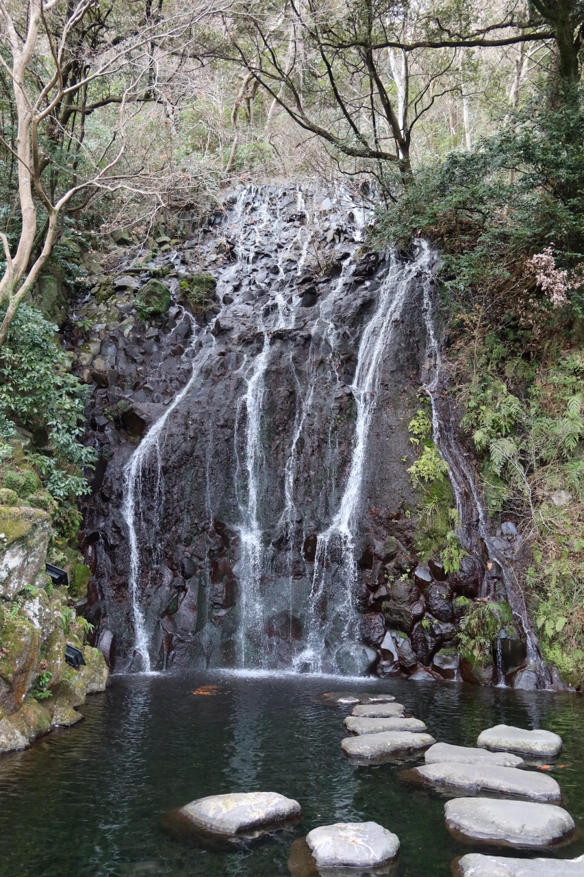 箱根湯本にある温泉宿の天成園の庭の裏山に二つ並んである滝です。左側が玉簾の瀧、右側が飛烟の瀧です。玉簾の瀧は幅が広く、与謝野晶子が詩にも読んだ名瀑、飛烟の瀧は高さが20mあり、勢いがあります。どちらが好みかと言うと、玉簾の滝の方が神秘的で美しいと私は思いました。どちらの滝の下の池にも鯉が優雅に泳いでいます。