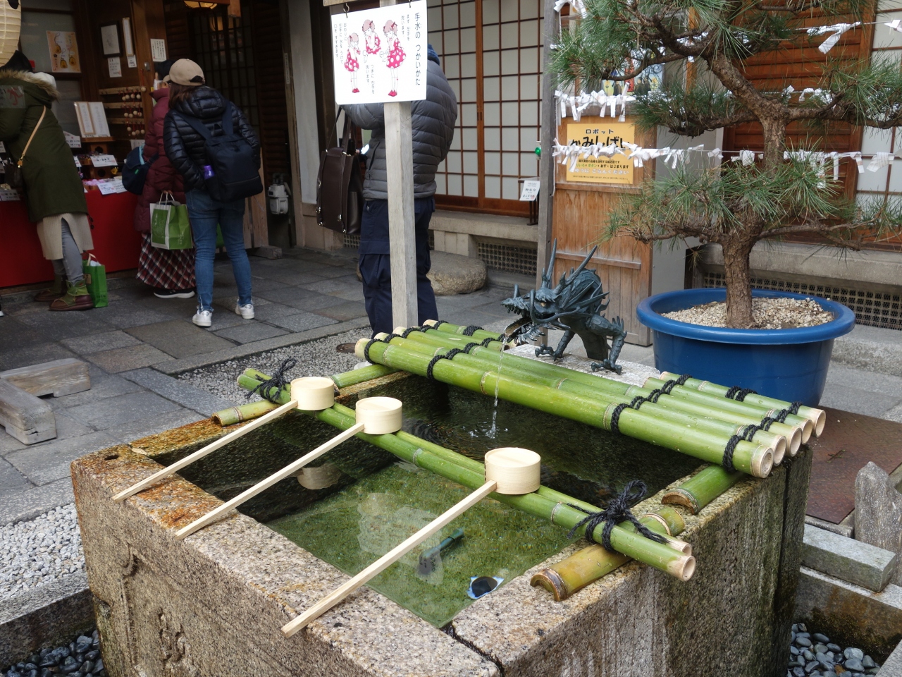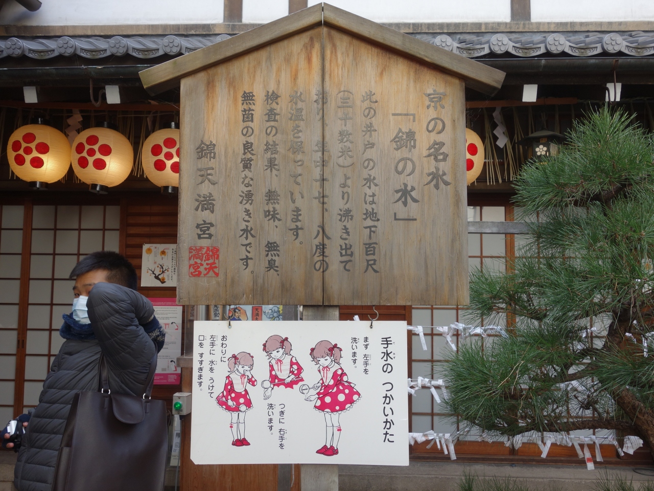 京都には名水が出ているところがいくつかあります。(まあ,教えたくないので教えませんが。梨木神社のが有名です。)錦天満宮はその一つです。入口を入って,左右に二箇所水がでています。どちらもおなじ水ですが,左側(北側)のお水は,汲めるようになっています。ペットボトルご持参でいらしてください。