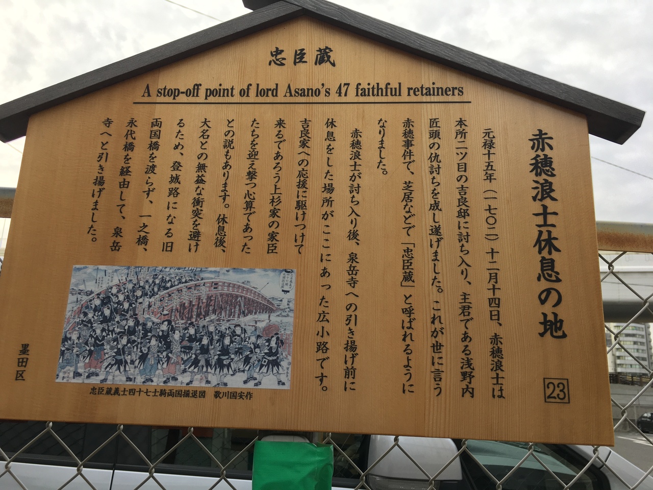 赤穂浪士が浅野内匠頭を仇討ちを果たした後に、この場で小休止をしたためにそれを示す案内板が立てられていました。ここから南に3キロメートルほど行った永代橋近くにも赤穂浪士の休息の石碑がありますので、赤穂浪士は仇討ち後は休み休み戻ったのでしょうか。それにしても残念ながら案内板以上のものは何もありません。